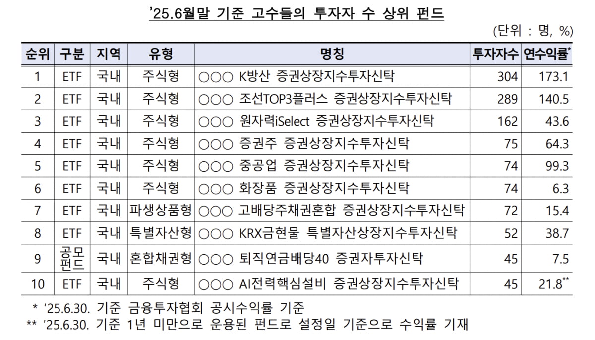국내 펀드는 조선·방산·원자력 등 특정 산업 중심의 테마형 상품 비중이 높았다. 해외 펀드는 미국 빅테크 편중이 확인됐다. 성과가 높았던 상품으로는 K방산 ETF(연 173.1%), 조선TOP3플러스 ETF(연 140.5%), 원자력 iSelect ETF(연 43.6%), 중공업 ETF(연 99.3%), 테슬라 밸류체인 ETF(연 50.9%) 등이었다.