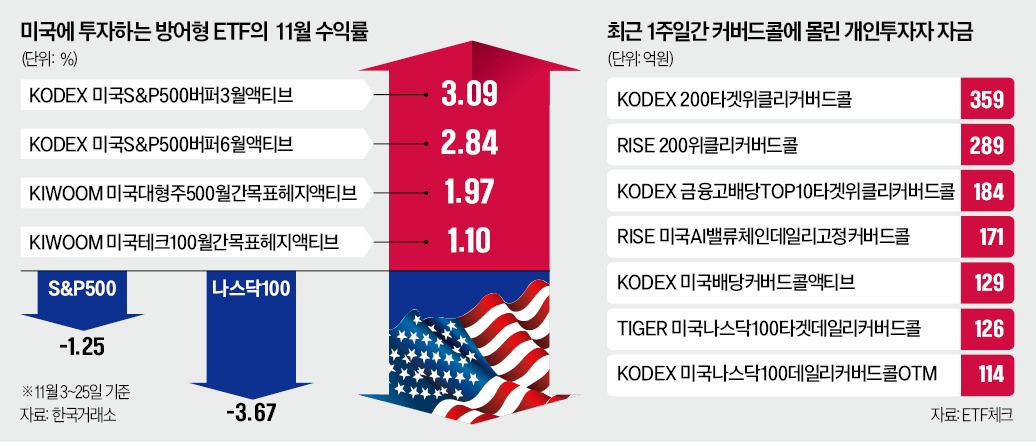 인공지능(AI) 거품론으로 국내외 증시가 요동쳤지만 주가 하락을 방어하도록 설계된 구조화 상장지수펀드(ETF)는 오히려 시장을 웃도는 수익률을 기록했다. 상승장을 일부 따라가면서도 하락폭을 제한하는 ‘중위험·중수익’ 전략이 변동성 장세에서 성과를 내고 있다는 평가가 나온다.