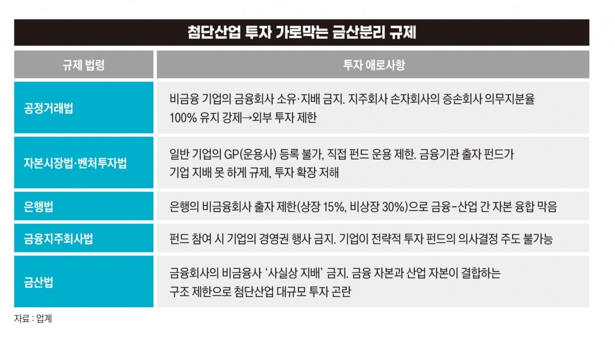 대한상공회의소 등 경제단체는 지주회사가 자산운용사를 소유할 수 있게 해 전략산업 펀드를 조성하도록 정치권에 건의했다. 기획재정부와 산업통상부 역시 첨단산업 경쟁력 확보 차원에서 금산분리 취지를 훼손하지 않는 범위 내 제도 완화에 찬성하는 분위기다.