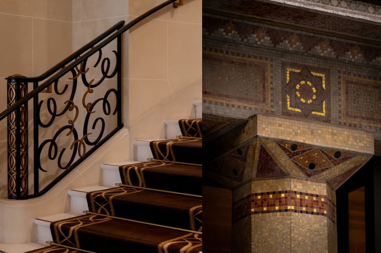 호텔 로비로 들어서면 높은 층고를 메운 흑백의 대리석이 눈길을 사로잡는다. 공간을 채우는 것은 디테일이다. 기하학적인 문양의 모자이크와 직선과 곡선의 라인이 어우러져 중후하면서도 우아한 분위기를 만들어낸다. 1910년부터 1930년대까지 파리를 사로잡았던 아르데코 양식을 보여주는 전형적인 공간이다.