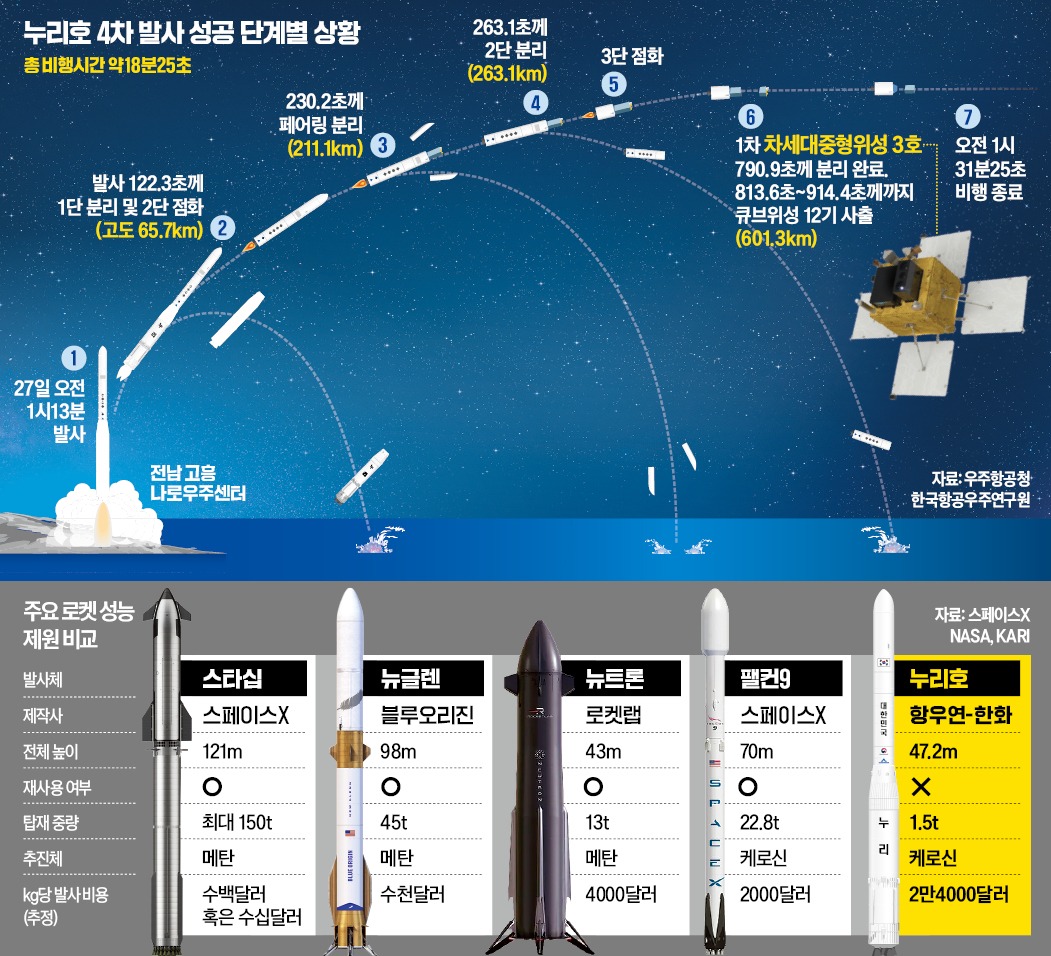 산업계는 누리호가 안정성을 증명한 만큼 정부가 재사용 발사체 개발을 적극 지원해야 한다고 지적했다. 1회용으로 쓰고 버리는 천문학적 가격의 로켓에 재사용 기능을 부여해 회당 발사 비용을 대폭 낮춰야 한다는 것이다. 고도 3만6000㎞에 1t짜리 정지궤도 위성을 올리는 데 드는 발사 비용은 차세대 발사체 환산 기준 ㎏당 8만6186달러로 추정된다. 재사용 발사체 스페이스X 팰컨9 발사 비용인 ㎏당 수천달러와 차이가 극명하다.