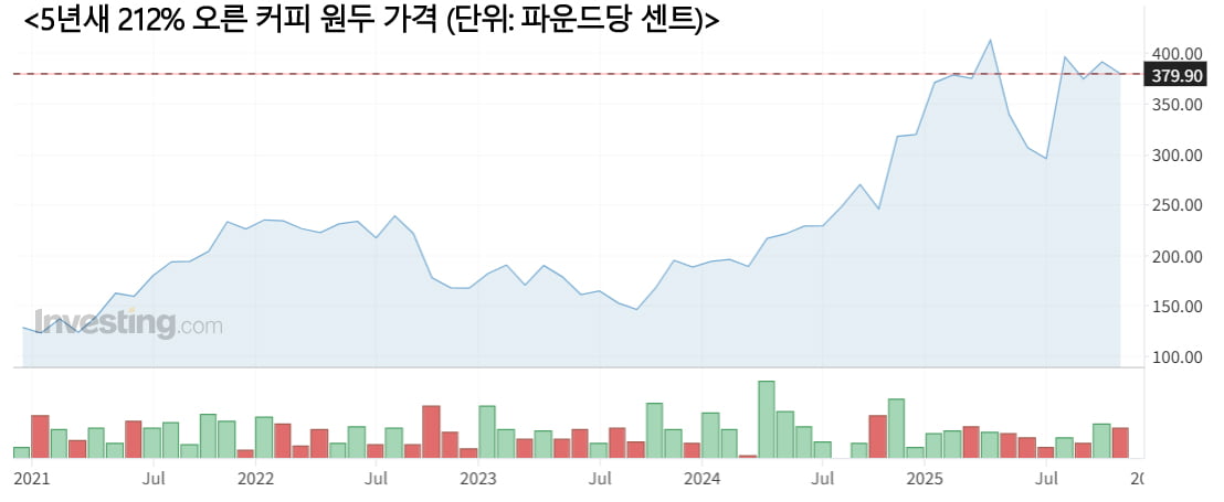 주요 원재료 가격이 확 오른 것도 큰 부담이다. 27일 미국 선물시장에서 아라비카 원두 근월물은 파운드당 3.7990달러에 거래됐다. 5년 전에 비하면 212% 급등했고, 1년 전에 비하면 16.42% 높은 가격이다.