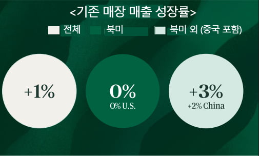 신규 점포를 제외한 매장별 매출 등락을 보여주는 글로벌 기존점 매출 수치는 2년만에 처음으로 반등했지만, 전년동기 대비 1% 늘어난 정도에 그쳤다. 미국 기존점 매출은 지난 9월 한 달간은 늘었지만, 3분기 전반으로는 보합 수준을 보였다. 이 기간 카페 멤버십 프로그램인 스타벅스 리워드를 쓰는 회원 수도 전년 동기 대비 1% 늘었다.