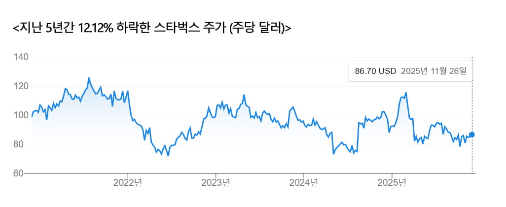 미국 나스닥에 상장된 스타벅스는 지난 5년간 수익률이 ‘마이너스’다. 2020년 11월27일부터 지난 26일까지 주가가 12.12% 빠졌다. 같은 기간 나스닥지수가 90.19%, S&P500지수는 87.24% 오른 것에 비하면 형편없이 초라한 성적이다. 올들어선 주가가 5.93% 내렸다.