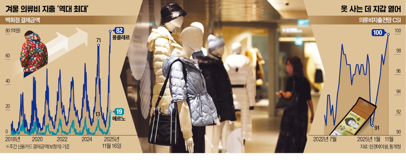 백화점 고급 의류 판매는 역대 최대치를 경신했다. 대체데이터 플랫폼 한경에이셀(Aicel)에 따르면 백화점에서 신용카드로 ‘몽클레르’ 브랜드 제품을 구매한 금액(추정치)은 지난 16~23일 82억원으로 작년 같은 기간 대비 75.0% 늘어났다. 신세계인터내셔날이 수입·판매하는 ‘에르노’ 결제금액은 19억원으로 같은 기간 181.1% 급증했다. 롯데지에프알이 유통하는 ‘캐나다구스’도 191.7% 늘었다. 모두 주간 기준으로 역대 최대치다. 패딩 매출이 11월 말에서 12월 초 정점을 찍는다는 점을 감안하면 이례적인 판매 호조다.