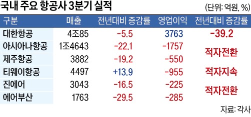 LCC의 실적 부진은 더 심각하다. 제주항공, 티웨이항공, 진에어, 에어부산 등 상장 LCC 4사는 3분기에만 2000억원 넘는 영업 적자를 냈다. 제주항공은 3분기 영업손실 550억원을 내며 적자 전환했다. 매출도 3882억원으로 전년에 비해 19.2% 감소했다. 지난해 12월 무안공항 사고 이후 일부 노선을 축소하고 기단 운용에 차질을 빚은 탓이다. 유럽 등 장거리 노선을 확대 중인 티웨이항공은 투자 비용이 늘어나면서 3분기 영업손실이 955억원으로 전년 동기(영업손실 60억원)보다 16배 가까이 급증했다. 작년 3분기 흑자를 기록했던 진에어, 에어부산도 각각 200억원을 웃도는 적자를 냈다. 매출도 진에어(-16.5%), 에어부산(-29.5%) 등 모두 전년보다 감소했다.