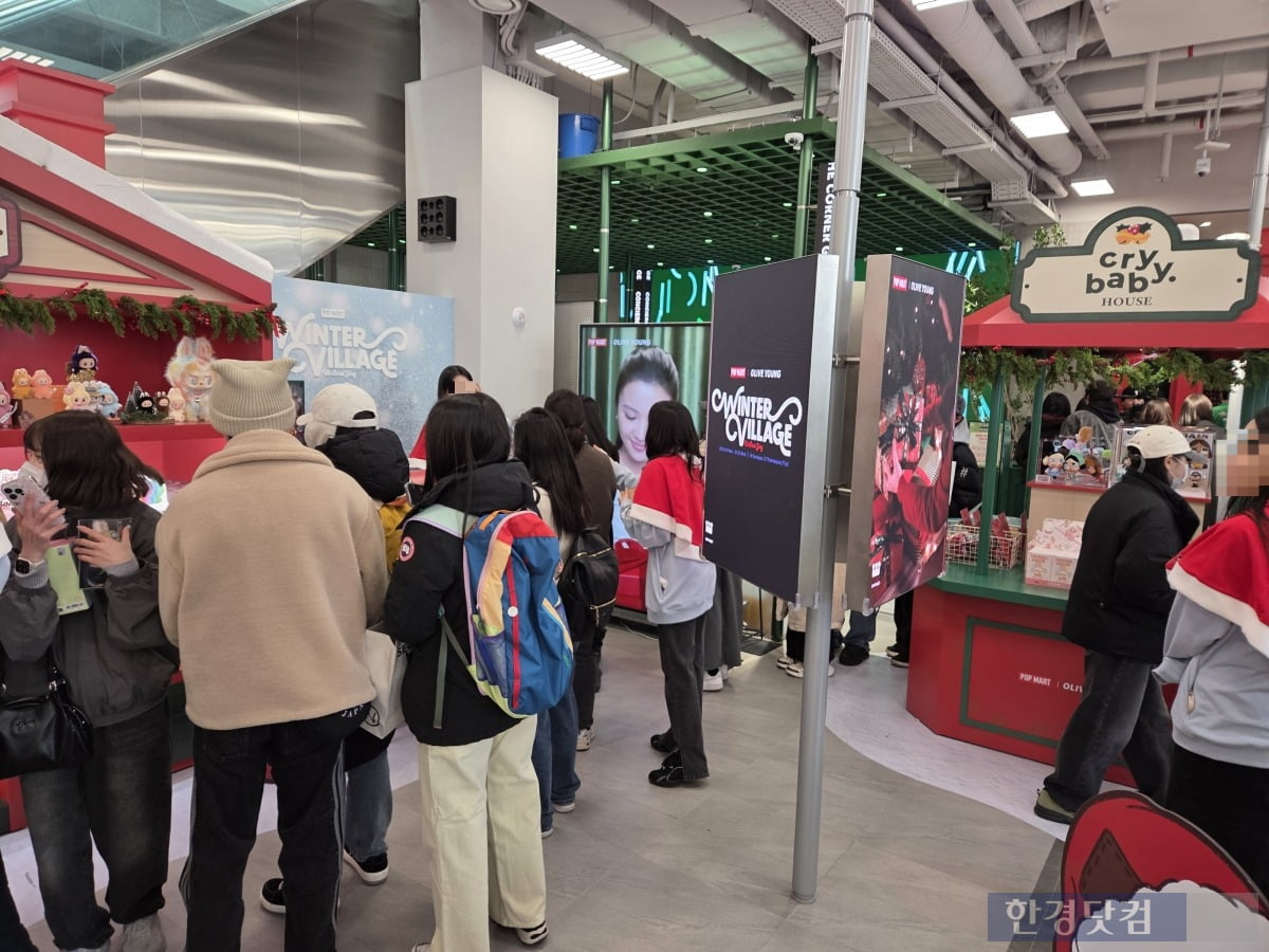 이날 직접 매장을 방문해보니 1층 전체가 팝마트와 협업한 공간으로 구성돼 있었다. 연말 분위기를 반영한 ‘팝마트 윈터 빌리지’ 콘셉트로 기획됐으며 출입구 바로 앞에는 팝마트 캐릭터 장식으로 꾸며진 크리스마스 트리가 설치돼 시선을 끌었다. 계산대 주변에는 고객이 몰리는 상황을 대비해 별도 결제 대기 동선 등도 마련돼 있었다.