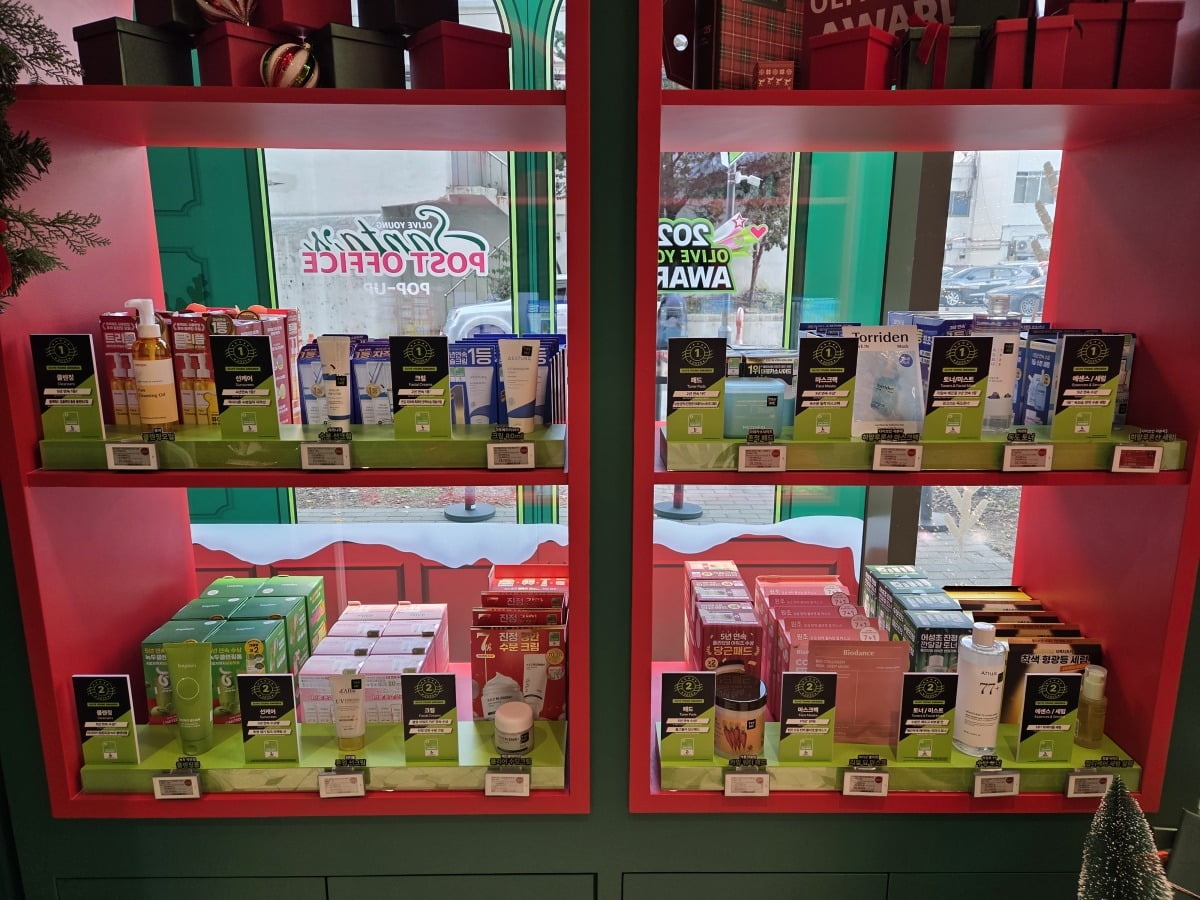1층 가장 안쪽에는 올해 올리브영 어워즈 대표 수상 제품을 모아놓은 공간이 마련됐다. 글로벌, 색조, 헤어&바디, 헬시, 스킨케어 등 다양한 카테고리의 인기 상품이 전시돼 있었다. 대부분 단품이 아닌 세트 상품이나 기획 구성으로 준비됐는데 여러 제품을 한 번에 체험할 수 있도록 하면서 구매로 자연스럽게 이어지도록 하려는 전략으로 풀이된다.
