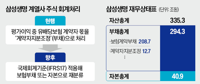 IFRS17을 적용하면 보험사는 계열사 주식 매각 계획을 세워 재무제표에 보험부채로 반영해야 한다. 생보업계는 2023년 IFRS17 도입을 앞두고 이 같은 회계처리가 재무제표 이용자의 오해를 유발할 수 있다고 주장했다. 금감원은 이를 받아들였고 2022년 말 회계기준서상 ‘일탈 조항’을 근거로 과거 방식(계약자지분조정)을 허용했다.