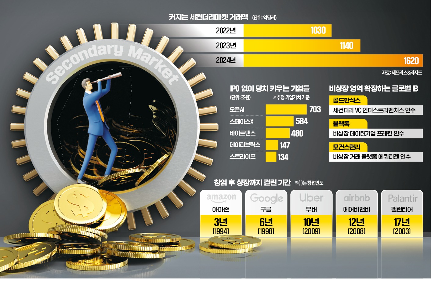 IPO가 당연했던 과거와 달리 지금은 비상장으로도 충분한 자금 조달이 가능해지면서 적지 않은 유망 기업이 비상장 상태를 이어가고 있다. 블룸버그에 따르면 1999년 미국 테크 기업이 창업 후 상장에까지 걸리는 기간은 평균 4년이었다. 현재(2024년 기준)는 11년으로 늘었다. 1994년 설립된 아마존은 창업 3년 만에 나스닥에 입성했지만 2008년 창업한 에어비앤비는 12년이 지난 2000년에야 상장했다. 맥킨지에 따르면 기업 가치 창출의 80~95%는 상장 전 단계에서 일어난다. 일부 VC만 투자에 참여하는 단계를 이미 넘어섰다는 얘기다.