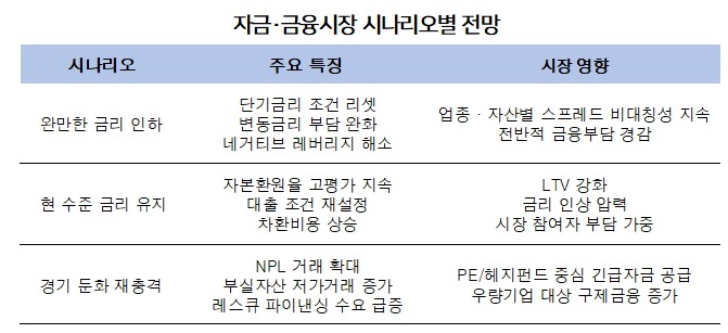 향후 자금·금융시장은 ①완만한 금리 인하 ②현 수준 금리 유지 ③경기 둔화에 따른 재충격 등 세 가지 시나리오로 상정해 볼 수 있다. 먼저 완만한 금리 인하 시에는 업종·자산별로 스프레드의 비대칭성이 여전히 있더라도, 전반적으로 단기금리 조건이 리셋되는 효과가 나타날 것이다. 이와 함께 변동금리 부담이 완화되면서 네거티브 레버리지가 해소될 것으로 예상된다. 두 번째로 고금리가 장기화된다면 상황이 달라진다. 자본환원율(Cap Rate)의 고평가 기조가 이어지고, 대출 만기 도래 시점에 주택담보인정비율(LTV) 강화, 금리 인상 등 대출 조건이 재설정될 가능성이 높다. 이는 차환비용 상승으로 이어져 시장 참여자의 부담을 가중시킬 것이다.