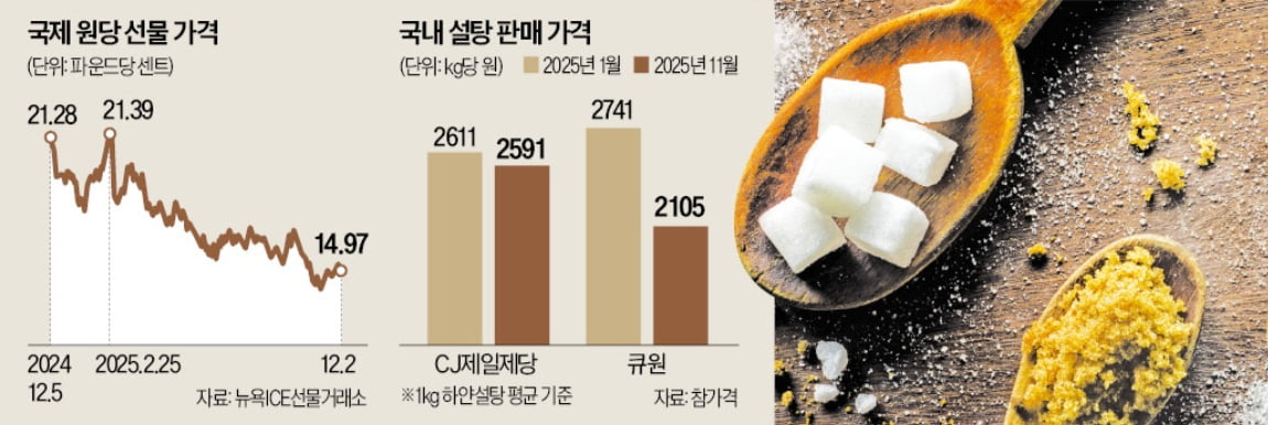 한국소비자원 참가격에 따르면 CJ제일제당 브랜드인 백설 하얀설탕 1㎏ 평균 소매 가격은 올해 1월 2611원에서 11월 2591원으로 거의 떨어지지 않았다. 같은 기간 원당 가격이 30% 넘게 떨어졌음에도 실제 소비자들이 느끼는 설탕값은 변화가 거의 없었단 의미다.