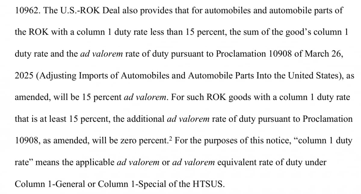 미국 정부는 상호관세와 자동차 및 자동차부품, 목재 관세를 합산한 관세는 15%를 넘지 않도록 한다고 밝혔다. 자동차 및 자동차 부품에 대해 인하된 관세는 지난달 1일 0시 1분(미 동부시간) 기준으로 소급 적용되며, 소비 목적으로 수입되거나 창고에서 소비를 목적으로 반출된 자동차 및 자동차 부품에 적용된다.