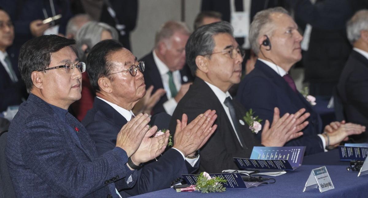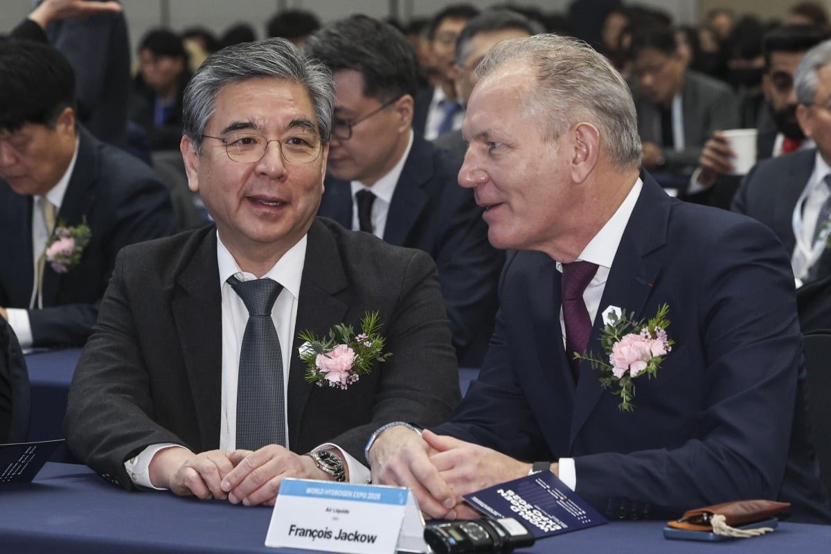 김성환 기후에너지환경부 장관과 장재훈 현대자동차그룹 부회장이 4일 경기도 고양시 킨텍스에서 열린 '세계 수소 엑스포 2025(World Hydrogen Expo 2025)' 개막식에서 참석자들과 기념촬영을 하고 있다.고양=임형택 기자 taek2@hankyung.com