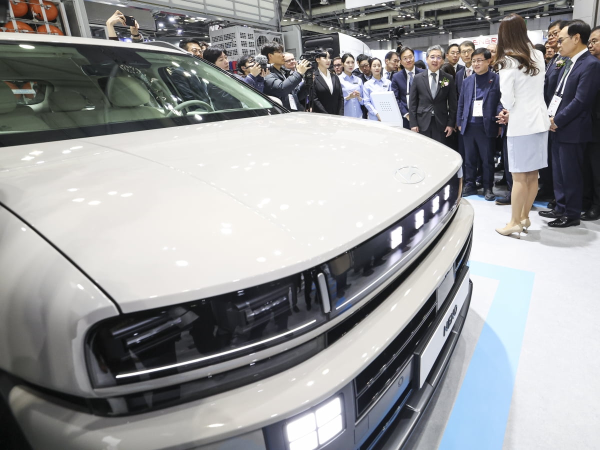 김성환 기후에너지환경부 장관이 4일 경기도 고양시 킨텍스에서 열린 '세계 수소 엑스포 2025(World Hydrogen Expo 2025)'에서 현대차그룹 부스에서 장재훈 현대자동차그룹 부회장 설명을 들으며 넥쏘를 시승하고 있다. 고양=임형택 기자 taek2@hankyung.com