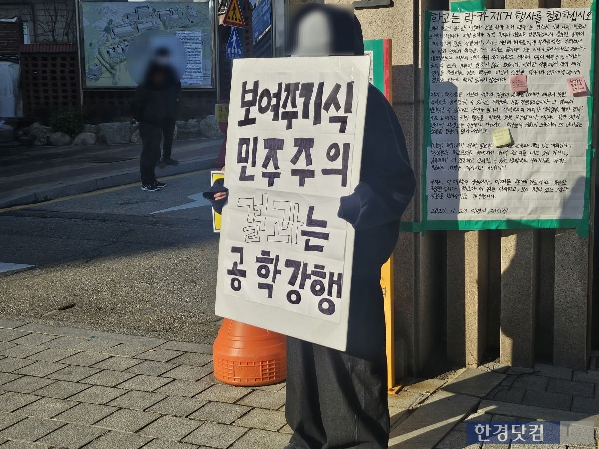 행사 시간이었던 오후 2시가 되자 정문 앞에는 '보여주기식 민주주의의 결과는 공학 강행'이라는 문구가 적힌 피켓을 든 3학년 A씨가 모습을 드러냈다.