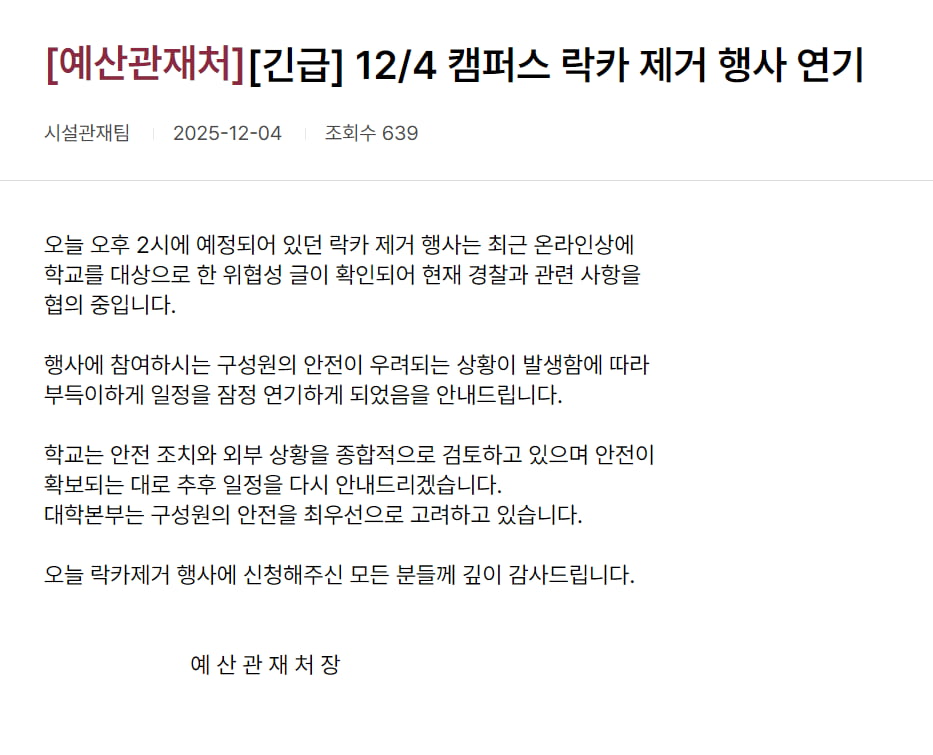 동덕여대는 이날 학생·교수·직원이 함께하는 래커칠 제거 작업을 진행할 예정이었으나, 온라인에 올라온 칼부림 협박 글로 인해 행사를 급히 미루게 됐다.이 행사는 지난 시위 과정에서 곳곳에 남은 래커칠을 구성원들이 함께 지우며 갈등을 봉합하겠다는 취지였다. 학교는 당초 이날 오후 2시 행사를 진행할 계획이었지만, 전날 "학교에 갈 준비가 됐다"는 영어 문구와 함께 가방 속 칼 사진이 첨부된 협박 글이 올라오며 안전 우려가 커졌다.