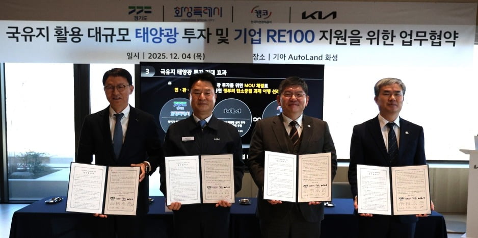 경기도와 화성특례시, 기아, 한국자산관리공사가 4일 기아오토랜드 화성에서 50MW 규모의 태양광 발전사업 추진을 위한 업무협약을 체결했다.