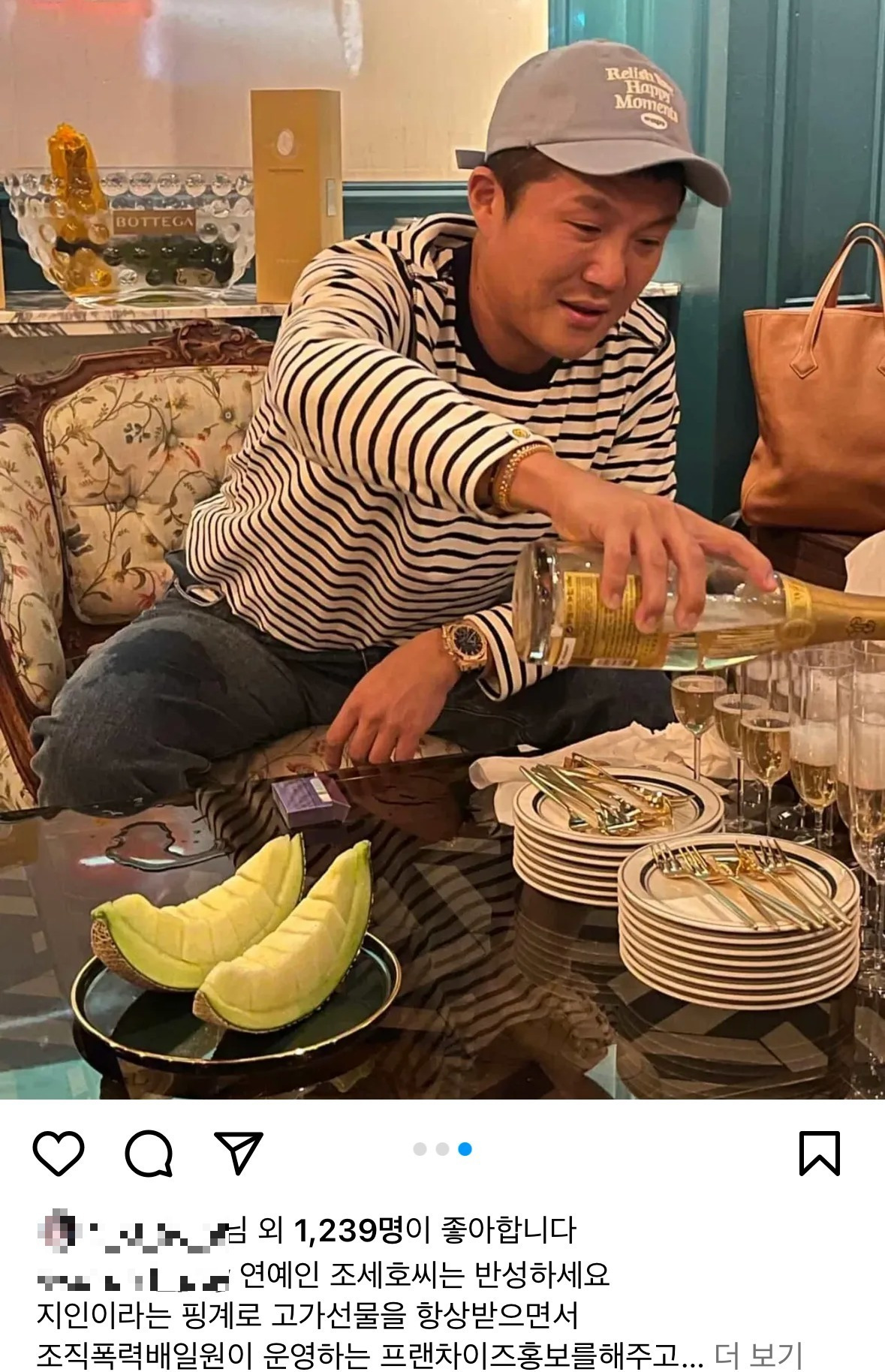 앞서 A 씨는 자신의 인스타그램에 조세호씨가 조직폭력배로 지목되는 A씨와 친분이 있다는 내용과 함께 사진을 올리며, "연예인 조세호는 반성하라. 지인이라는 핑계로 고가 선물을 항상 받으며 조직폭력배 일원이 운영하는 프랜차이즈 홍보를 해준다"며 저격했다.