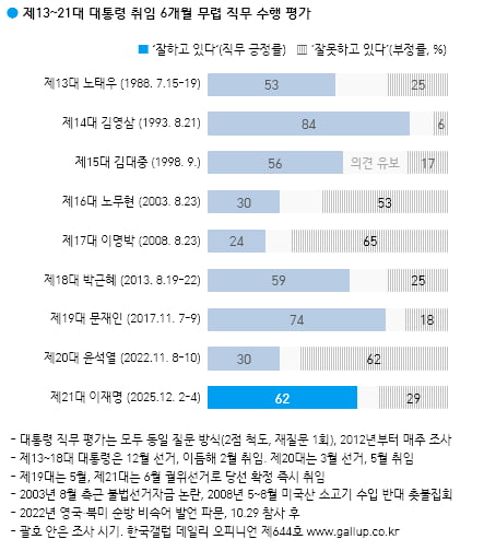 역대 대통령 취임 6개월 무렵 지지율 평가에서 이 대통령의 현재 지지율 수준은 김영삼 전 대통령(84%), 문재인 전 대통령(74%)에 이어 3위 수준이다.