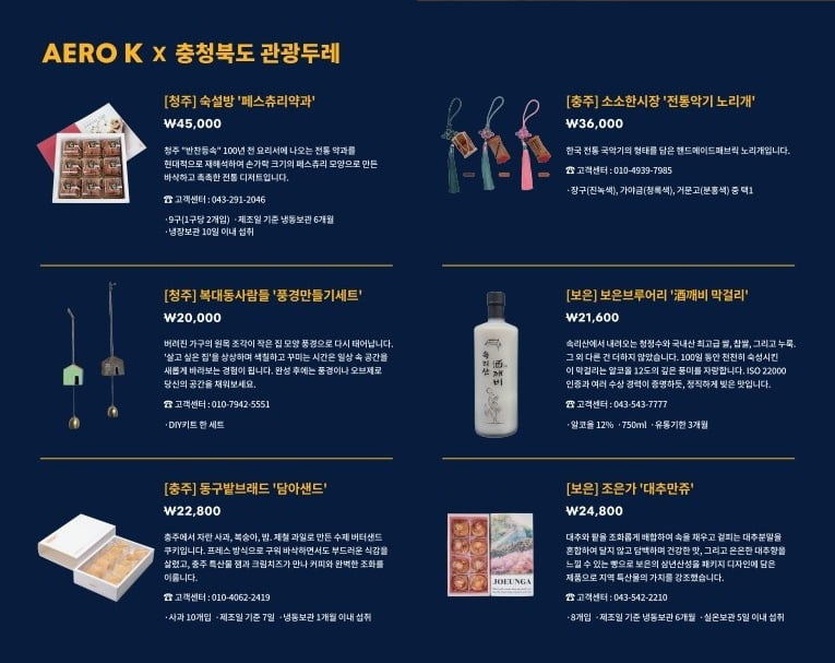 한국관광공사 세종충북지사는 오는 8일부터 충북 지역 관광두레 주민사업체 상품을 에어로케이 기내 주문배송 서비스로 선보인다. 청주 거점 항공사인 에어로케이와 함께 충북 지역 고유의 특색을 담은 우수한 제품을 국내외 관광객에게 알리기 위해 이번 협업을 추진했다.