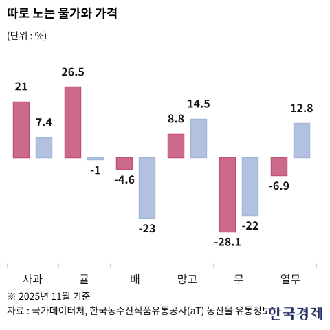 물가와 가격이 따로 노는 품목은 사과뿐만이 아니다. 귤의 경우 지난달 물가지수가 26.5% 상승했지만, aT 기준으로는 감귤(M과) 10개당 3813원에서 3774원으로 오히려 가격이 내려갔다. 배는 물가지수가 4.6% 떨어졌지만, aT에 따르면 지난해 11월 3만3694원(신고·10개)에서 올해 11월엔 2만5864원으로 무려 23% 하락했다.