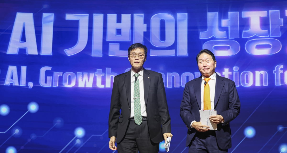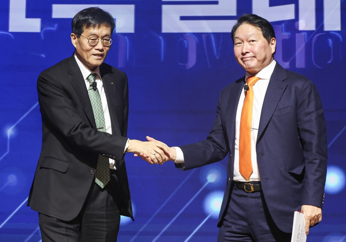 5일 서울 중구 대한상공회의소에서 열린 제4회 한국은행-대한상공회의소(BOK-KCCI)세미나 'AI 기반의 성장과 혁신'에서 최태원 대한상의 회장과 이창용 한국은행 총재가 특별 대담을 마친 뒤 이동하고 있다.임형택 기자 taek2@hankyung.com