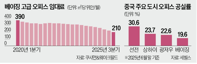 그런데도 공급 압력은 쉽게 줄지 않고 있다. 글로벌 부동산 컨설팅 기업 쿠시먼앤드웨이크필드는 베이징 고급 오피스 시장에 2026~2028년 약 180만㎡ 사무실이 신규 공급될 것으로 분석했다. 호황기에 계획된 오피스 공급이 이어지는 것이다.