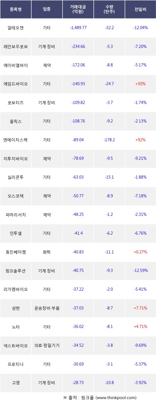 기관 투자자의 순매도 상위 20개 종목은 알테오젠, 레인보우로보틱스, 에이비엘바이오, 에임드바이오, 로보티즈, 올릭스, 엔에이치스팩32호, 지투지바이오, 실리콘투, 오스코텍등이다.