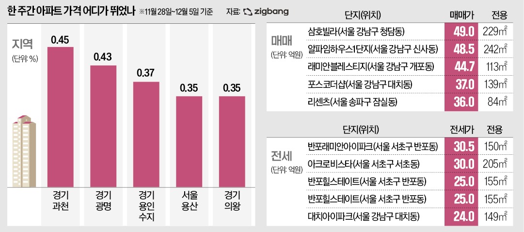 7일 부동산 플랫폼 직방에 따르면 지난주 전국에서 가장 비싸게 거래된 아파트는 서울 강남구 청담동 ‘삼호빌라’였다. 전용면적 229㎡ 물건이 49억원에 거래됐다. 같은 면적이 2016년 19억5000만원에 거래된 뒤 9년 만의 손바뀜이다. 강남구 신사동 ‘알파임하우스’ 전용 242㎡는 48억5000만원에, 개포동 ‘래미안블레스티지’ 전용 113㎡는 44억7000만원에 거래됐다. 이어 강남구 대치동 ‘포스코더샵’ 전용 139㎡(37억원), 송파구 잠실동 ‘리센츠’ 전용 84㎡(36억원) 등도 고가 거래에 이름을 올렸다.