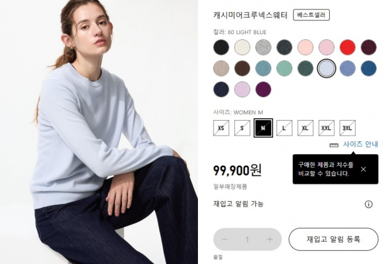 라이트블루 컬러 캐시미어 니트는 현재 전 사이즈가 품절된 상태다. 온라인 몰은 물론 매장에서도 라이트블루 컬러는 찾아볼 수 없었다.