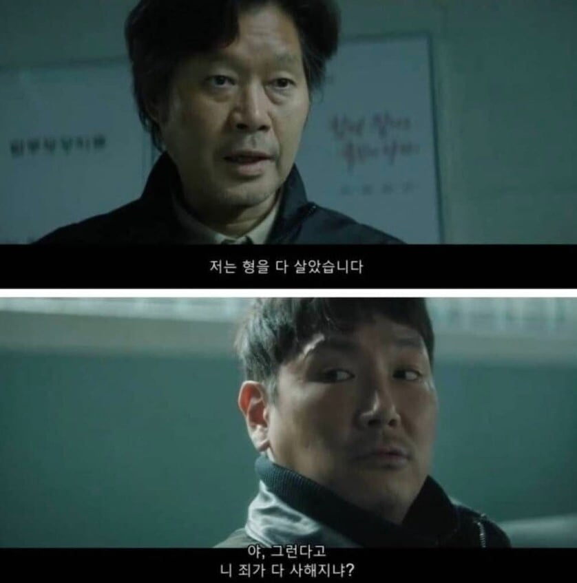 흉악범역을 맡은 배우 유재명이 조씨에게 "저는 형을 다 살았습니다"라고 하자 그는 "야, 그런다고 니 죄가 다 사해지냐"고 반박했다.