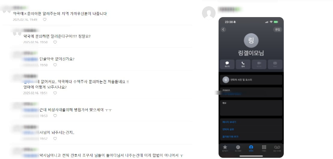 댓글에는 이른바 '링거 이모'로 추정되는 연락처가 공유되기도 했다. 일부 이용자들은 "약국에 문의하면 알려준다. 지역 가까운 분이 와서 놔준다. 약사가 시술하는 건 아니고 전직 간호사·간호조무사들이 놓아준다"고 적어 불법 시술이 구조적으로 이어지고 있음을 시사했다.