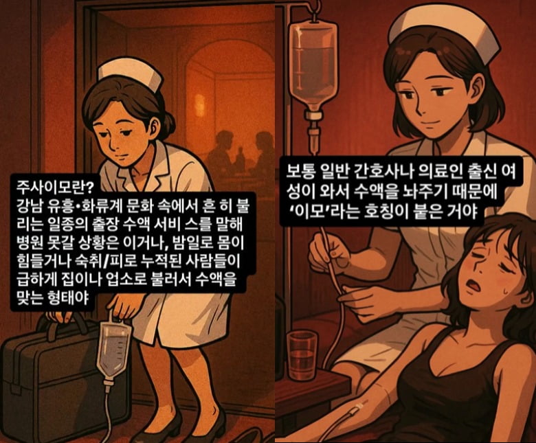 '주사이모', '주사 아줌마', '링거이모' 등은 비의료인이 허가되지 않은 장소에서 타인에게 주사·수액 등 의료적 처치를 해주는 이들을 지칭하는 은어다. 의료계에 따르면 이들 상당수는 간호사나 간호조무사 자격을 가진 경우가 많지만, 자격증 보유 여부와 상관없이 의사의 처방·직접 지시 없이 단독으로 시술하는 행위는 모두 불법이다.