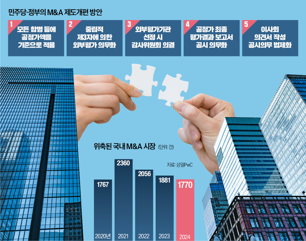 당정이 모든 상장사 합병에 주가(시장가) 대신 자산·수익 가치 등을 반영한 이른바 ‘공정가액’을 적용하도록 하는 자본시장법 개정을 연내 추진한다. 기업의 주가가 자산 가치 등보다 지나치게 낮은 상황에서 주가로 합병가액을 산정해 소액주주가 손해를 보는 문제를 원천 차단하겠다는 취지다. 시장에서는 공정가액 적용 의무화가 기업의 합병 비용을 키워 인수합병(M&A) 등 구조조정 자체를 위축시킬 수 있다는 우려가 나온다.