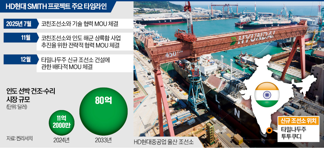 HD현대는 일정에 맞게 스미스 프로젝트를 착착 진행했다. 지난 7월에는 인도 코친조선소와 포괄적 업무협약을 맺고, 지난달 인도 해군 상륙함 사업으로 협력 범위를 넓혔다. 정기선 HD현대 회장도 지난달 방한한 인도 대표단에 “인도 조선업 발전을 돕는 최고의 파트너가 되겠다”고 약속했다.