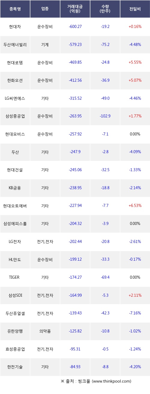 외국인 투자자의 순매도 상위 20개 종목은 현대차, 두산에너빌리티, 현대로템, 한화오션, LG씨엔에스, 삼성중공업, 현대모비스, 두산, 현대건설, KB금융등이다.
