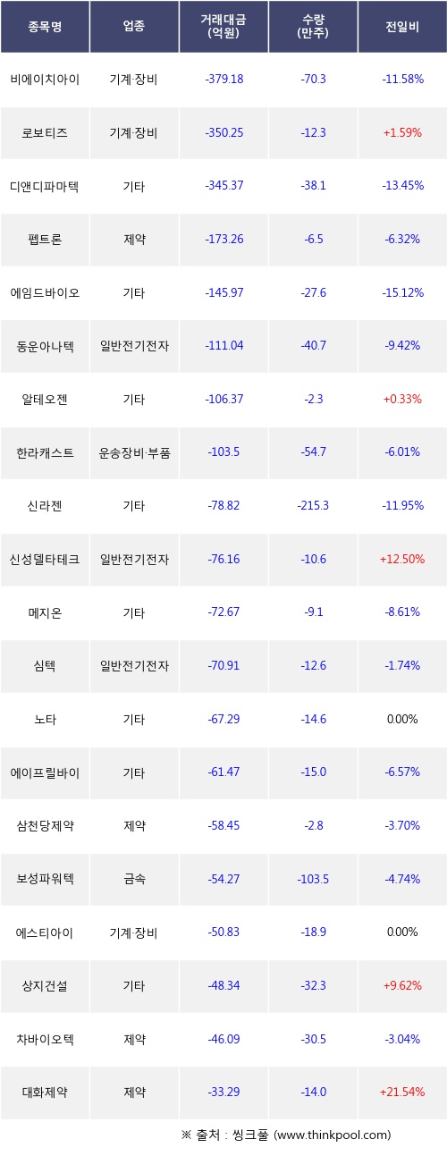 외국인 투자자의 순매도 상위 20개 종목은 비에이치아이, 로보티즈, 디앤디파마텍, 펩트론, 에임드바이오, 동운아나텍, 알테오젠, 한라캐스트, 신라젠, 신성델타테크등이다.