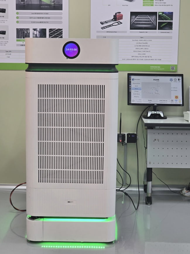 신성이엔지의 자율주행 기반 스마트 공기정화장치는 오염원 발생 위치로 스스로 이동·정화한다. 고정밀 무선 유해가스 측정 센서와 디지털트윈 기술로 공기질을 실시간 감지하고 오염원을 추적해 공간 사각지대를 최소화한다. 유기화합물(VOCs)·유해가스·미세먼지 등 6종 이상 유해물질을 제거하는 복합 필터와 재생 시스템을 적용해 운영 효율과 지속가능성을 확보하고, 산업현장·로비·복도 등에서 한 대로 넓은 공간을 정화한다.