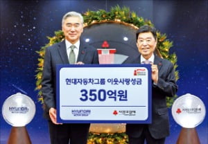 현대자동차그룹은 연말을 맞아 이웃사랑 성금 350억원을 사회복지공동모금회에 기탁했다고 9일 밝혔다. 현대차그룹은 이날 서울 정동 사회복지공동모금회관에서 성 김 전략기획담당 사장(왼쪽)과 김병준 사회복지공동모금회장 등이 참석한 가운데 ‘희망 2026 나눔 캠페인’ 성금 전달식을 열었다. 현대차그룹이 2003년부터 기탁한 성금은 총 4640억원에 달한다.현대차그룹은 성금 전달 외에 사회복지공동모금회와 협력해 유소년 스포츠단 활성화를 위한 ‘기프트카’, 학대 피해 아동 지원 및 아동학대 예방을 위한 ‘아이케어’, 글로벌 인재 육성 및 교육 불평등 해소를 위한 ‘H-점프스쿨’ 등 사회공헌 활동을 펼치고 있다.