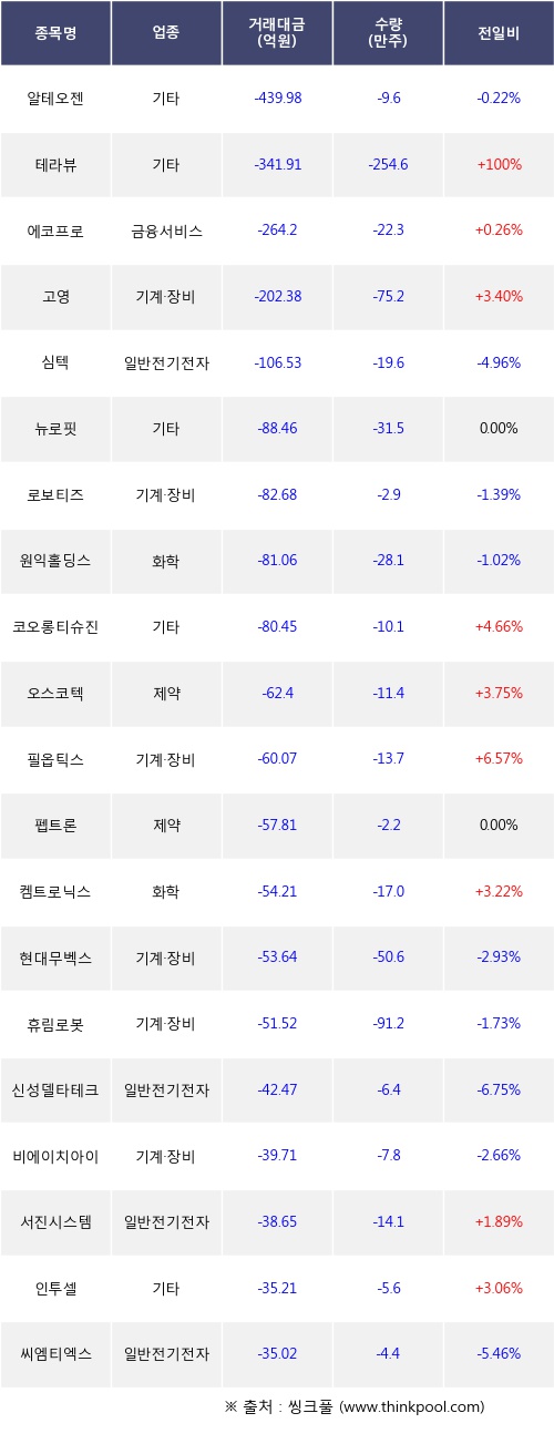 외국인 투자자의 순매도 상위 20개 종목은 알테오젠, 테라뷰, 에코프로, 고영, 심텍, 뉴로핏, 로보티즈, 원익홀딩스, 코오롱티슈진, 오스코텍등이다.