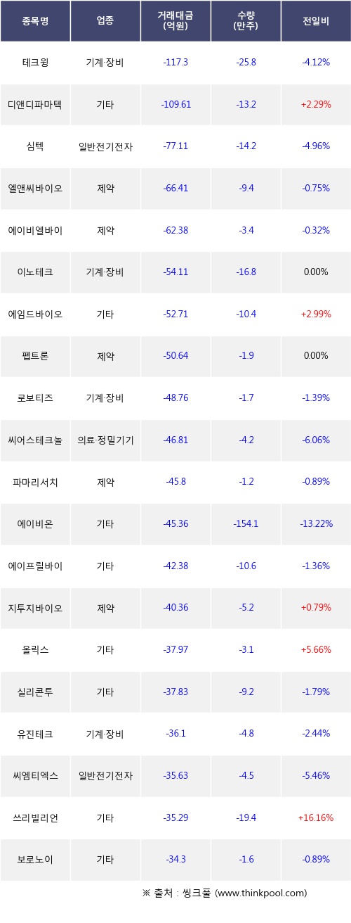 기관 투자자의 순매도 상위 20개 종목은 테크윙, 디앤디파마텍, 심텍, 엘앤씨바이오, 에이비엘바이오, 이노테크, 에임드바이오, 펩트론, 로보티즈, 씨어스테크놀로지등이다.