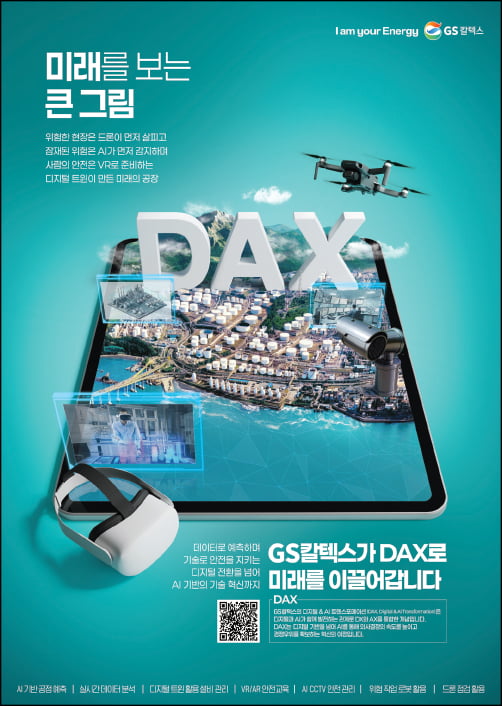 황성연 GS칼텍스 홍보부문장은 “대한민국 AI팩토리 선도기업 GS칼텍스가 다방면에서 다양하게 추진하고 있는 AI 기반 디지털 전환(DAX)과 산업안전 고도화 노력들을 소비자들에게 제대로 전달하고자 제작된 인쇄 광고”라며 “향후에도 DAX를 통해 우리의 사고방식과 일하는 방식의 변화, 발전되는 과정을 담아 전달함으로써 우리 사회 발전에도 기여할 수 있도록 노력할 예정”이라고 말했다.