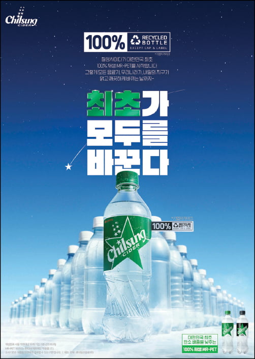롯데칠성음료는 올해로 75주년을 맞이하는 대한민국 대표 탄산음료 ‘칠성사이다’의 100% 재생 플라스틱(rPET) 도입을 알리는 광고로 2025년 한경광고대상 브랜드대상을 받았다. 이번 캠페인은 ‘최초가 모두를 바꾼다’는 강렬한 메시지를 담았다. 칠성사이다가 국내 최초로 재생 원료 100%를 사용한 500mL 페트병 제품을 출시하며, 미래 세대와 지구를 위해 앞장서는 선제적 행보를 보여주었다는 평가다. 제품 라벨에는 ‘100% RECYCLED BOTTLE’이라는 문구를 넣어 정체성을 명확히 하고 디자인 또한 기존의 둥근 하단에서 양각 무늬를 넣은 각진 형태로 바꿔 세련미와 그립감을 동시에 잡았다.