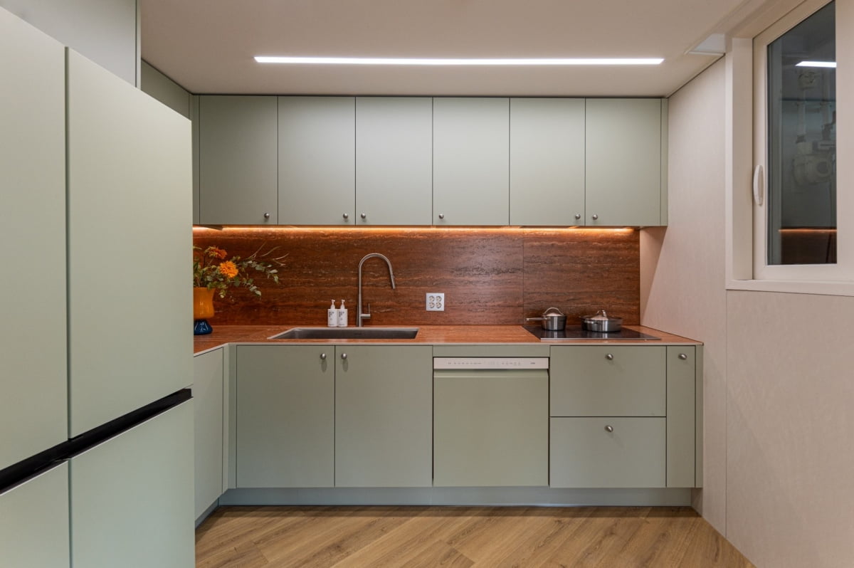 주방 벽면부에는 방염 성능을 갖춘 벽장재 콜렉트월 ‘루이스화이트’ 제품을 적용해 디자인과 실용성을 함께 고려한 설계를 제안했다.