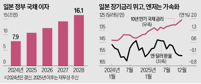 장단기 금리 상승은 1100조엔 넘는 국채를 발행한 일본 정부의 부담으로 이어질 전망이다. 재무성은 장기 금리가 올해 연 2%에서 2028년 연 2.5%로 오를 것으로 예상했다. 이에 따라 이자는 지난해 7조9000억엔에서 2028년 16조1000억엔으로 두 배가량 증가할 것으로 추산했다.