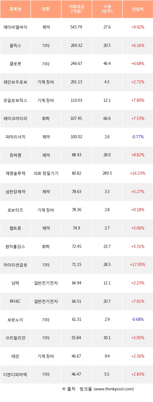 에이비엘바이오, 올릭스, 클로봇 등은 전일 대비 주가가 상승했고, 파마리서치, 보로노이 등은 주가가 하락했다.