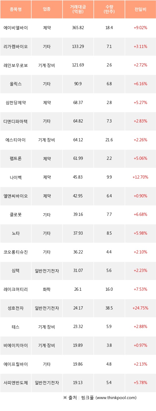 기관 투자자의 순매수 상위 20개 종목은 에이비엘바이오, 리가켐바이오, 레인보우로보틱스, 올릭스, 삼천당제약, 디앤디파마텍, 에스티아이, 펩트론, 나이벡, 엘앤씨바이오등이다.