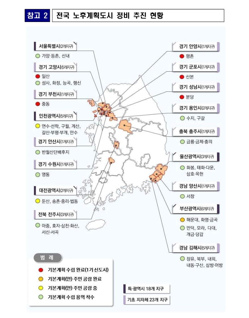 국토부 이상주 국토도시실장은 "부산, 인천, 대전의 노후계획도시정비 기본계획 주민 공람과 선도지구 선정이 순차로 추진 중"이라며 "지방자치단체 10여곳이 기본계획안을 수립하는 등 노후계획도시정비의 전국적인 확산이 본격화하고 있다"고 설명했다.