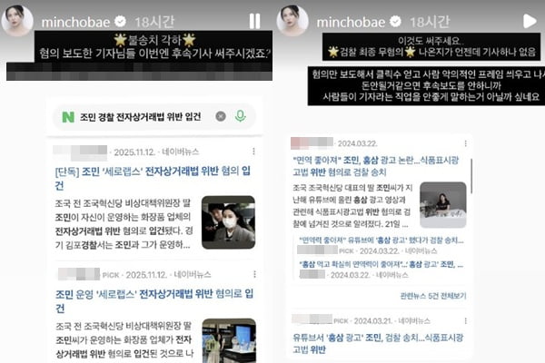 조 대표의 딸 조씨도 이날 자신의 인스타그램 계정 스토리를 통해 운영하는 화장품 업체가 전자상거래법 위반 혐의로 경찰에 입건됐으나, 불송치 처분됐다고 밝히며 "혐의 보도한 기자님들, 이번엔 후속기사 써주시겠죠?"라고 했다.